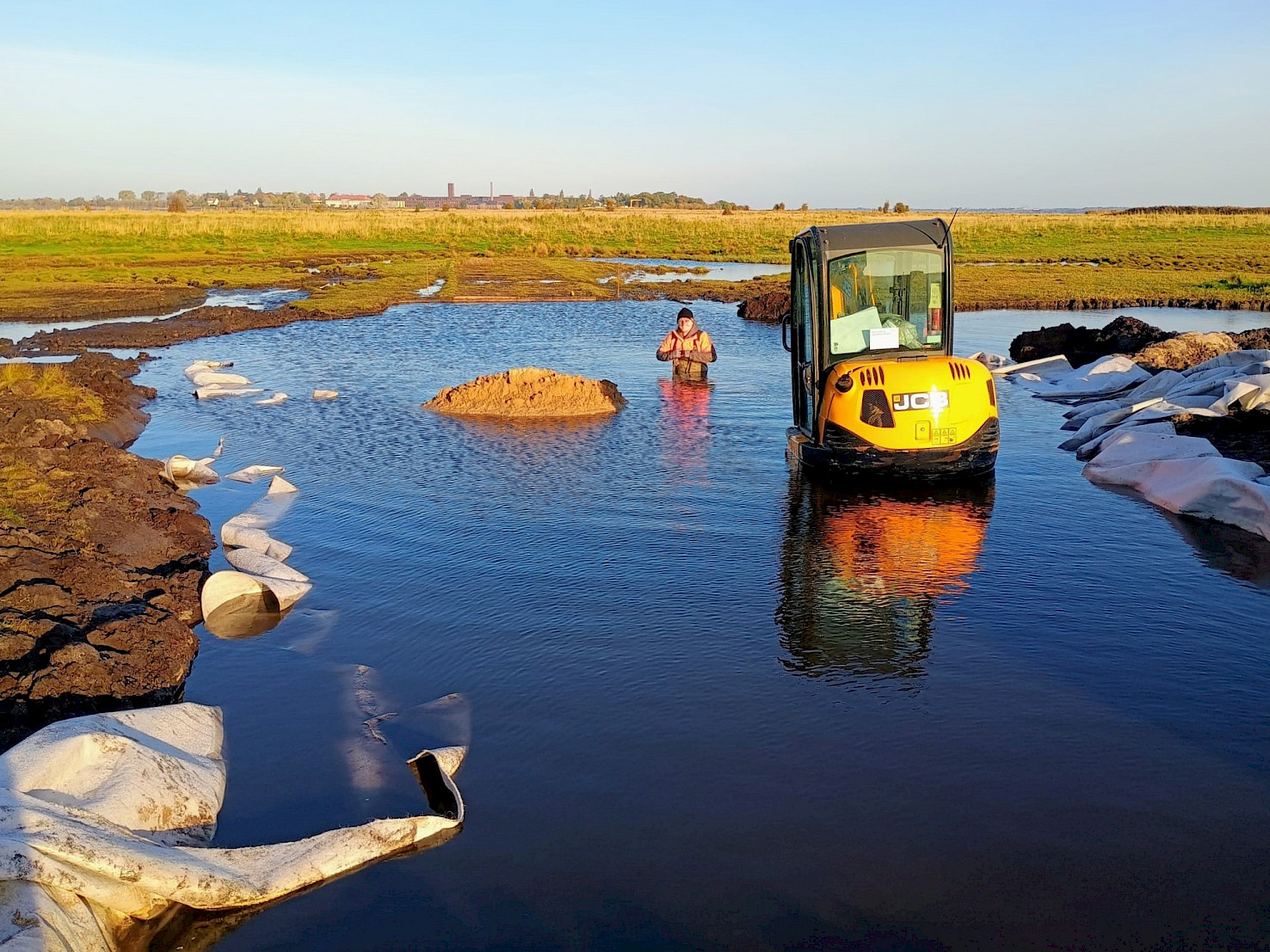 Nach den Baumaßnahmen im Südteil der Karrendorfer Wiesen von 2019 bis 2023, die ein naturnahes Zu- und Abflusssystem geschaffen haben, folgt nun der Nordteil. Seit Anfang September 2024 baut die Succow Stiftung in den Karrendorfer Wiesen. Es werden im Rahmen des Verbundprojekts schadhafte Furten erneuert, Priele ertüchtigt und die Zugänglichkeit verschilfter Bereiche für die Rinder wiederhergestellt. Die Arbeiten sind herausfordernd: Zweimal mussten sie wegen hoher Wasserstände pausieren. Der Baustellenleiter war dennoch gut auf den besonderen Arbeitsort „Küstenüberflutungsmoor“ vorbereitet – passende Ausrüstung inklusive.