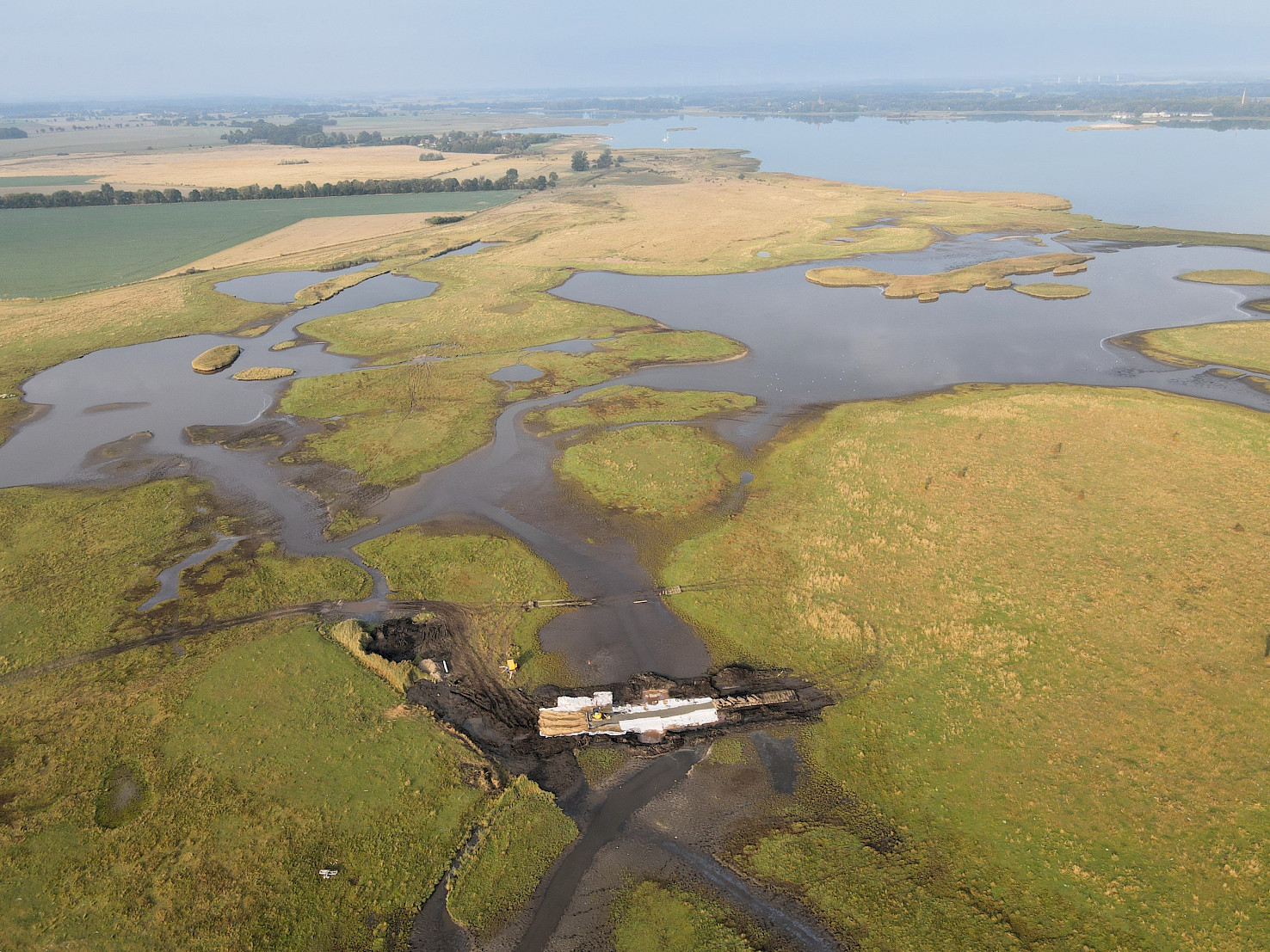 Nach den Baumaßnahmen im Südteil der Karrendorfer Wiesen von 2019 bis 2023, die ein naturnahes Zu- und Abflusssystem geschaffen haben, folgt nun der Nordteil. Seit Anfang September 2024 baut die Succow Stiftung in den Karrendorfer Wiesen. Es werden im Rahmen des Verbundprojekts schadhafte Furten erneuert, Priele ertüchtigt und die Zugänglichkeit verschilfter Bereiche für die Rinder wiederhergestellt. Die Arbeiten sind herausfordernd: Zweimal mussten sie wegen hoher Wasserstände pausieren. Der Baustellenleiter war dennoch gut auf den besonderen Arbeitsort „Küstenüberflutungsmoor“ vorbereitet – passende Ausrüstung inklusive.